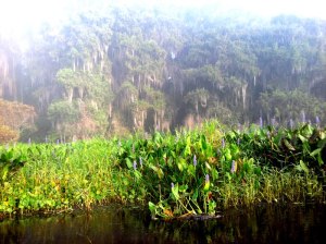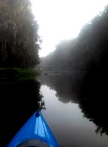 Cross Creek has become my go-to paddle, the place where reminders why I get up at 6AM to do this are abundant, and I needed that after yesterday. I have no idea what the Creek looks like during the heat of the day, but in the early morning, it is downright hallucinatory: the water an oily black, solid rolls of fog, giant cypress and Spanish Moss catching the sun an hour before it touches the ground, and every imaginable heron, egret, coot, moorhen, or duck. Even the smell of the rotting hydrilla is not an unpleasant one, and bringing up a fright wig of the stuff with each paddle is a small price to pay for such beauty.