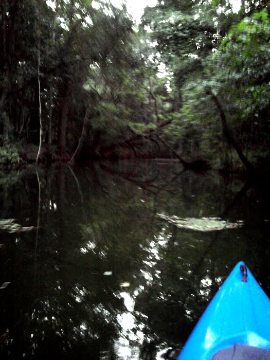 Camps Canal, which (allegedly) connects Prairie Creek with River Styx, is dark and still at midday, but at 630AM it is ghostly and asleep: a thin sheet of fog floats inches above the water, shadows appear larger than their source, pockets of heat rise up from God knows where, and it is so silent that the loudest sound is dew dropping from trees and cars crossing the bridge at CR234 a mile back. The day shift is starting to show up (two Great Blues standing by the ruined bridge) and the night shift is heading to wherever it goes in the daytime: note below a Barred Owl and my first kayaking photo capture of a bonafide living creature. I can do a passable Barred Owl impression, so I did and got an affirmative head cock in return. Victory.