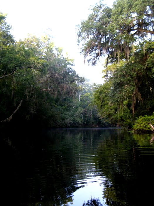 Yet you would not know that this piece of it belongs to the same river. It may not be remote, but the few homes you see along its banks (and it does have legitimate river banks) are well-kept and I get the impression the owners seem to appreciate how fortunate they are to be part of this river. I collect postcards of this part of old Florida and now I realize why: they represent the idealized landscape that one actually experiences on rivers like this: the Spanish Moss, the towering cypress, the fog, the black water.