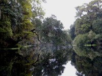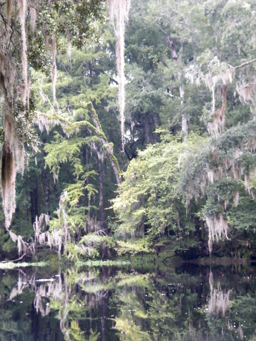 When I left the house this morning, it might as well have been nighttime–there was no hint of the sunrise and the clouds hung low. By the time I put in at 441, it was not much brighter, but the subdued lighting made everything hallucinatory. I imagined faces in the shadows of submerged logs and ancient cobwebs in the muted grey-greens of the Spanish Moss. No appreciable difference exists between upstream and downstream here, and yet I imagined that my kayak was sucking down into the water as I approached and came back from River Rise. Perhaps the river really was rising here?