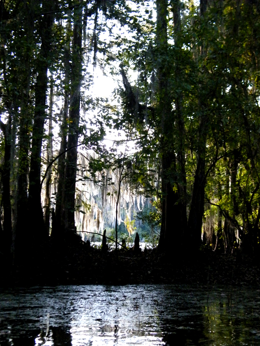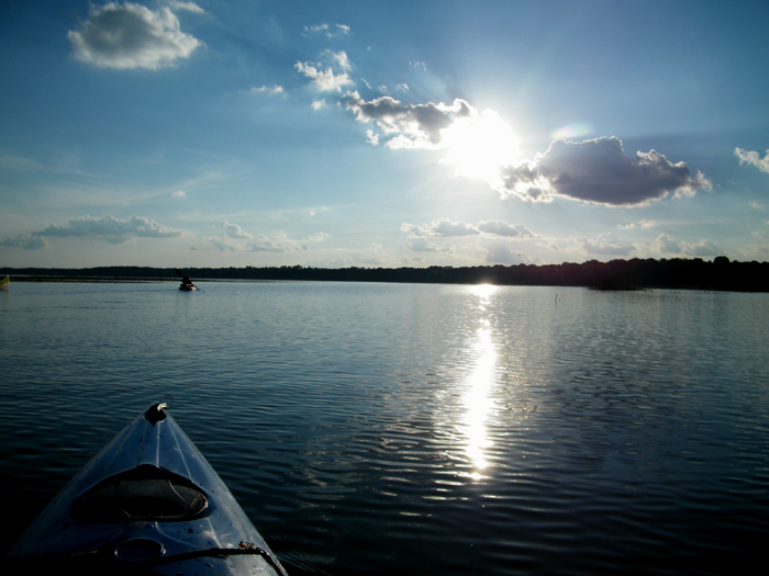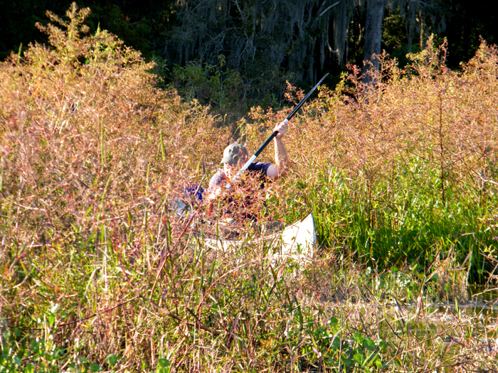 We took the open lake back to where we entered, which was thankfully next to a gathering of lily pads, else we probably wouldn’t have found it before dark. The sun blinded us to everything above the surface, but not to the occasional gator bubble trails. I’ve been told that Newnan’s gators have adapted to the hunters, staying farther offshore than they are accustomed to take advantage of the numerous avenues of escape that open water provides. In fact, we saw none between the shore and the tussocks, only on the open water.