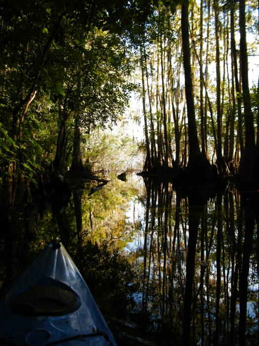 On the north shore, the lake changed once again, as the water cleared and the tussocks became less prominent. We found a creek that I haven’t been able to locate on any map and paddled into its dark canopy. My friend’s canoe drew too much water to make it very far, but I was able to progress down a few hundred yards or so until fallen trees prevented further exploration. My wetlands scientist friend has told me tales of snakes dropping into boats in places like these, and I must admit I would have welcomed such drama. As I told him, the more I paddle, the more wilderness I crave.