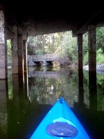The part of Prairie Creek that had always scared me the most was the Second Bridge. The first bridge is tall and holds Hawthorne Road above the creek. The second bridge is much smaller and supports the Gainesville-Hawthorne trail–and is much closer to the water, as in scraping-up-against-mud-dauber-wasp-nests closer. Thanks to a ornery mood before putting in, and near-record-low water levels, I was ready to shoot the gap, which I did without incident.