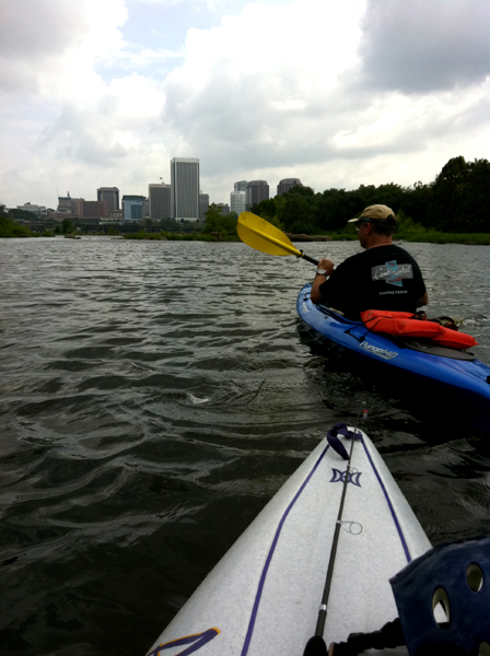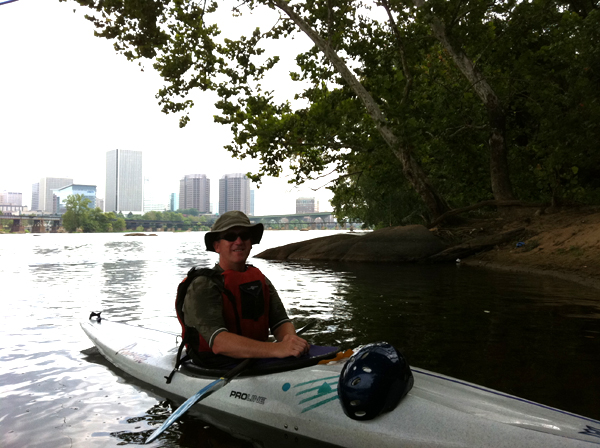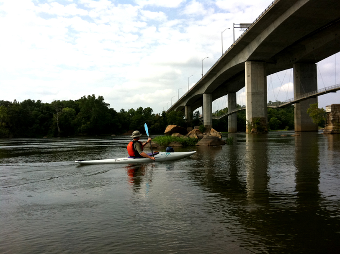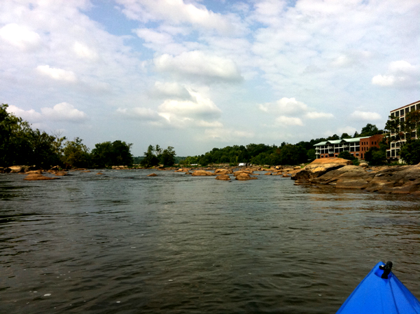 I know I make a big deal out of the blessed solitude of kayaking, but in truth I love nothing more than kayaking with someone else, especially if that someone is one of those No-Time-Has-Passed friends. Couple this with something I have never done, like kayaking in downtown Richmond, and some rocks and whitewater, and I am in heaven. I left a good bit of precious blue plastic on the rocks (nothing like watching pieces of your kayak float downstream in front of you) but that was a small price to pay for this amazing crawl through the James River–a place where I swam and swallowed gallons of water as a child. I didn’t swallow any this time around, but I did take some in the boat. Progress.