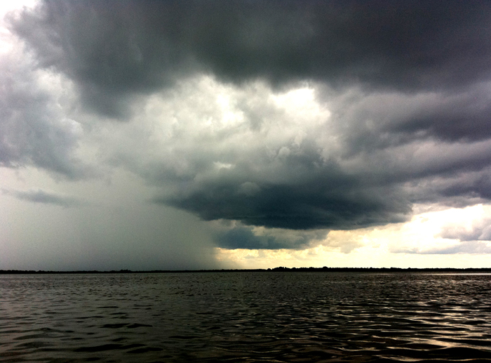 I took my best kayaking photo on the day I felt least like kayaking. I was down, mired in that spiral of self examination that turns into itself until all solutions have been sealed off. It is a feeling with which I am very familiar. I don’t even know the particulars of that day, only that I had no energy and that something told me to get my boat in the water. Once there, I pulled out the camera, took a few obligatory shots, finished paddling, and went home. The result was the picture to your left. I don’t even remember seeing the clouds or taking the picture.